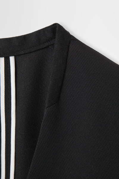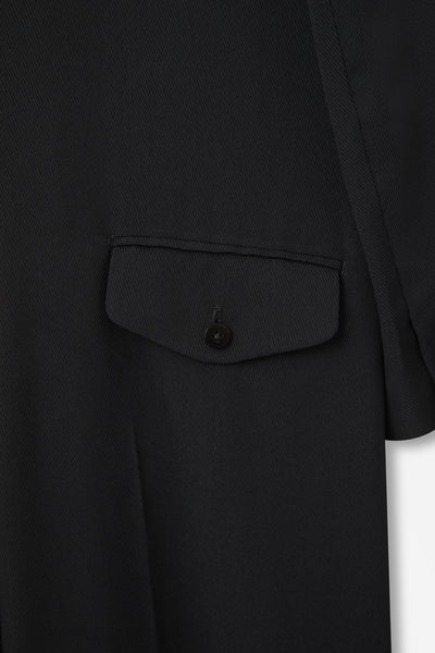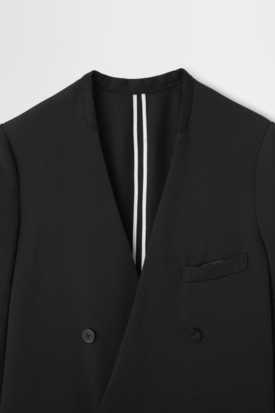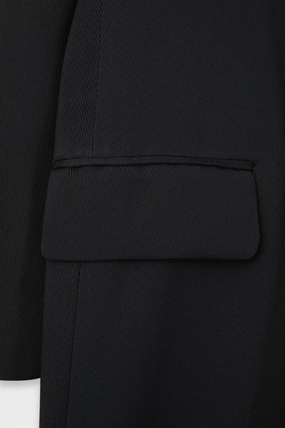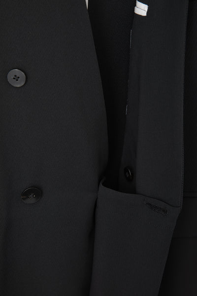 前身頃はダブルのジャケットをベースにした構造で、クラシックな印象を残しつつも着脱しやすい実用性を備えている。