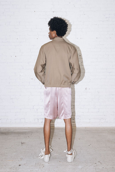 裾はゴム仕様とし、コンパクトなシルエットにまとめている。襟先にはボタンを配し、襟を立ててスタンドカラーとしての着用も可能。