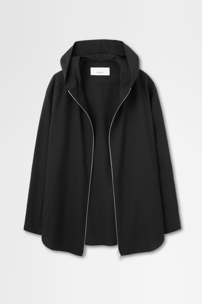 定番のフード付きウールシャツから、ジップアップタイプが登場。フロントにはファスナーを配し、首元まで閉めることでハイネックとしての着用も可能となっている。